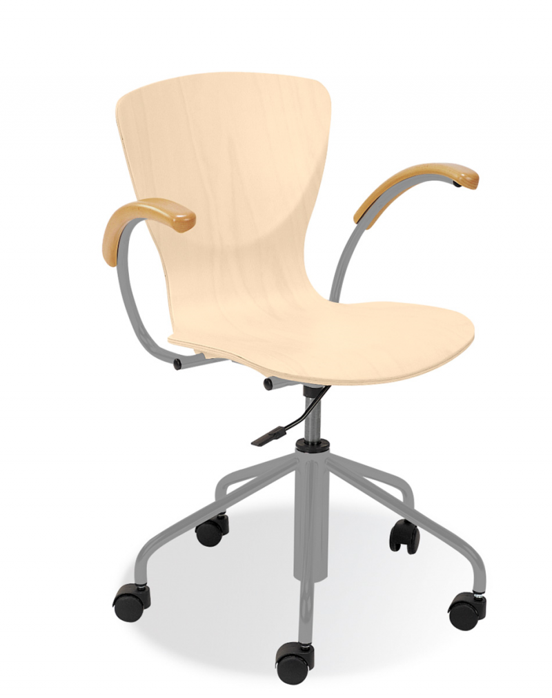 Fotel biurowy z siedziskiem z profilowanej sklejki bukowej. Nakładki na podłokietniki ze sklejki ( także w wersji laminowanej ). Rama stabilna, malowana na kolor czarny lub chromowana.
