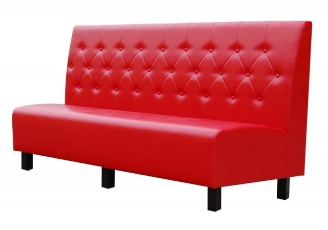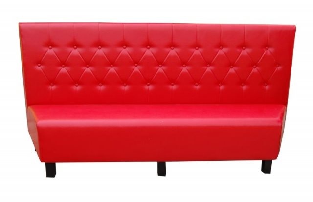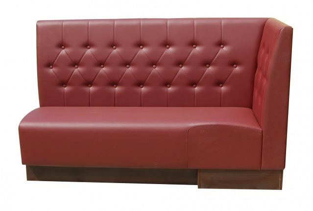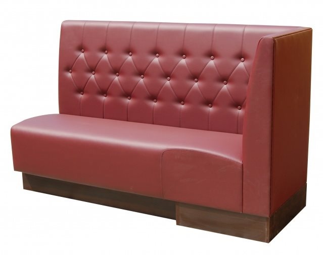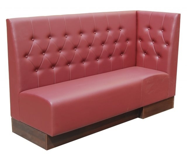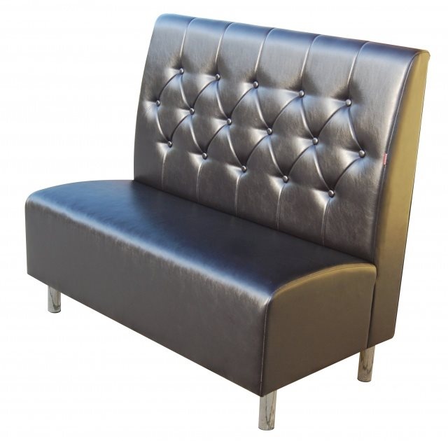 Loża restauracyjna SONIA H110 cm dostępna jest w wersji standardowej gładkim siedziskiem i oparciem lub z oparciem z przeszyciami karo pikowanym guzikami, na czarnych, metalowych nogach o wysokości 15 cm. Panel tylny sofy wykonany z wigofilu. Za dodatkową opłatą istnieje możliwość wykonania go w wersji tapicerowanej.