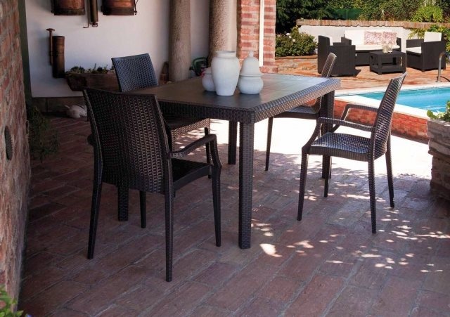 Model o klasycznym kształcie, z ozdobnym wzorem imitującym rattan, idealny do gastronomii, na taras czy ogródek.