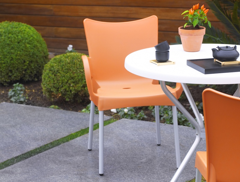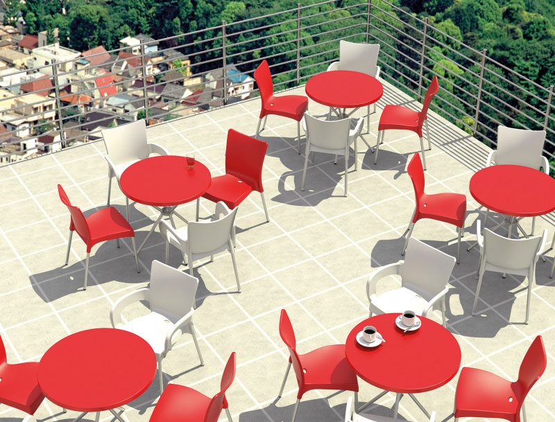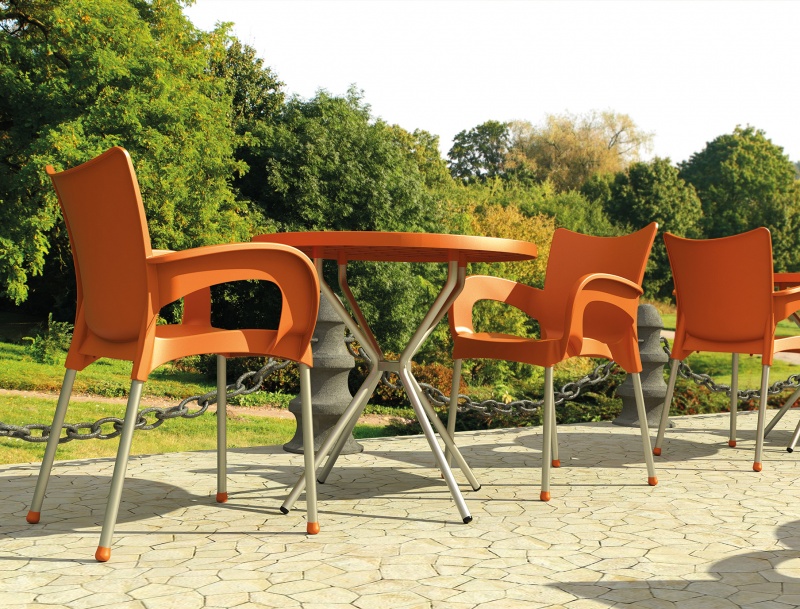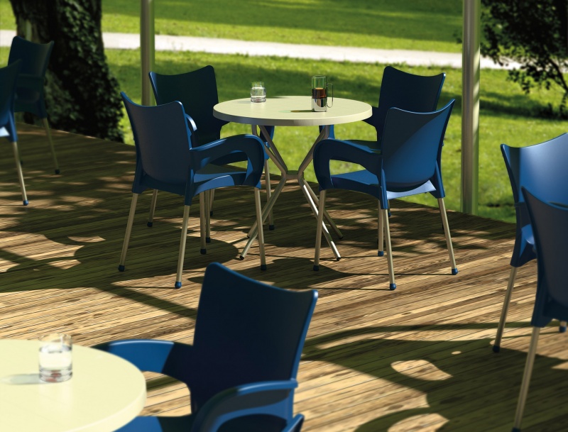 Stół z nogami wykonanymi z anodowanego aluminium, a blatem w wysokogatunowego tworzywa - polipropylenu. Model nadający się zarówno do wnętrz jak i na zewnątrz.